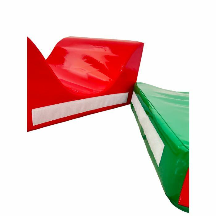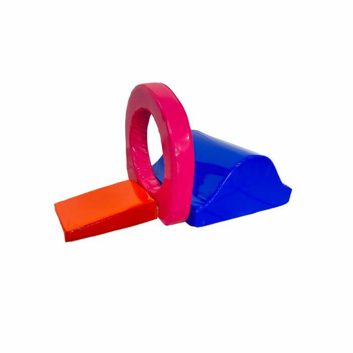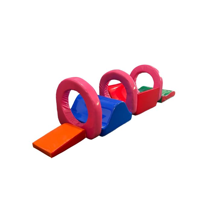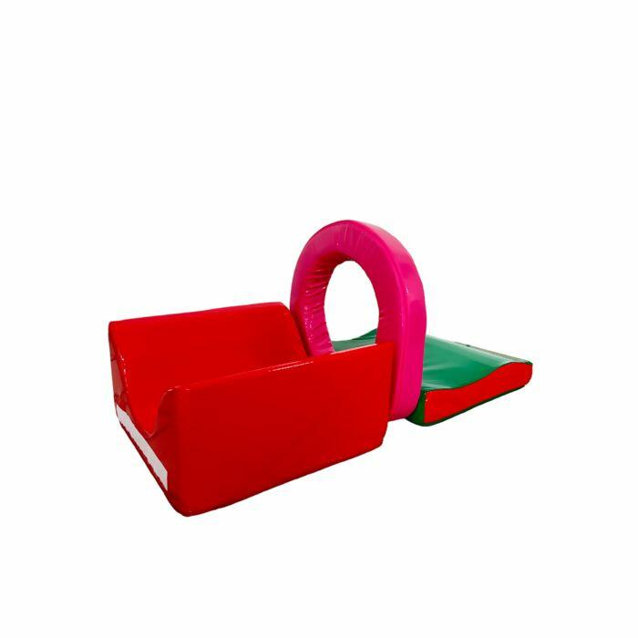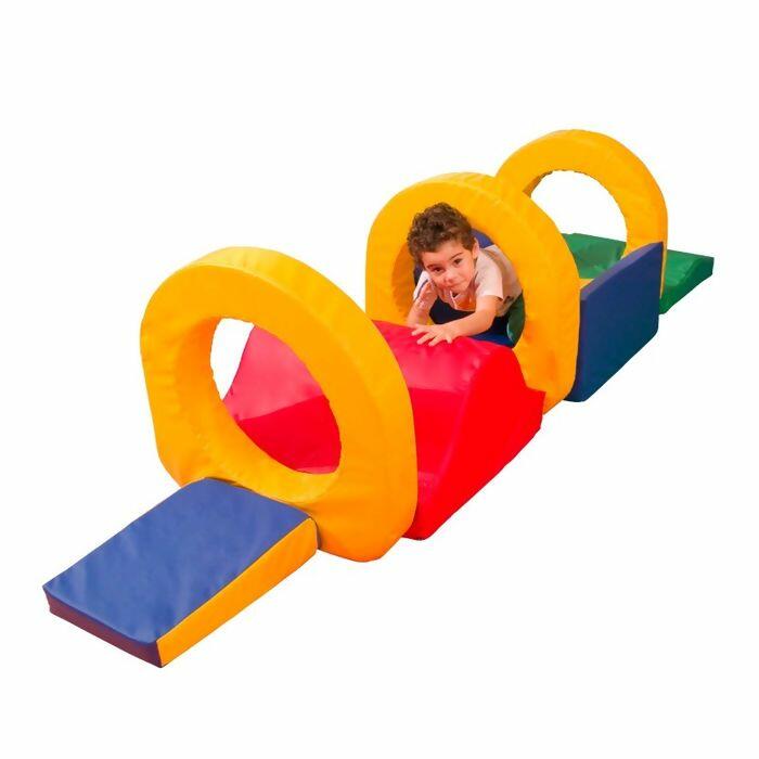 Túnel humano: As crianças uma de cada vez irão percorrer o espumado conforme foto ilustrativa do mesmo, cada uma que finalizar passagem irá manter-se em quatro apoios, como se fosse uma continuação do brinquedo. O próximo a passar pelo brinquedo irá também passar por debaixo do colega que está compondo o brinquedo também e assim sucessivamente. A intenção é realizar a proposta de todas as crianças serem parte do túnel.