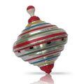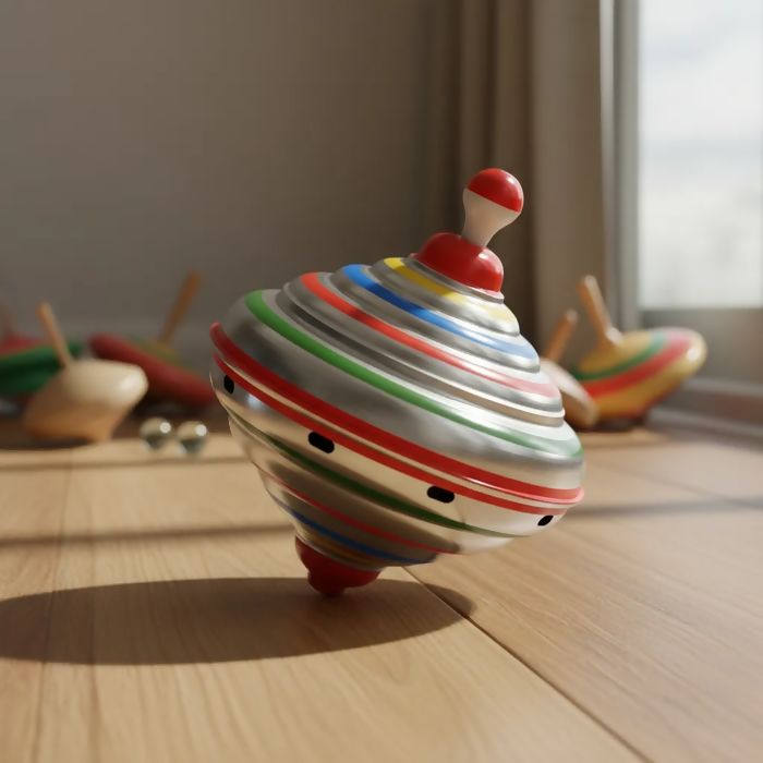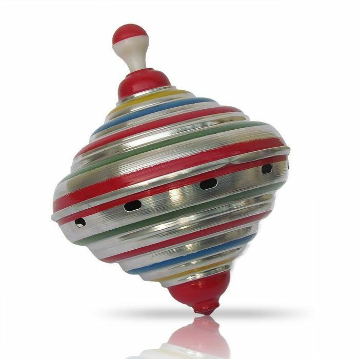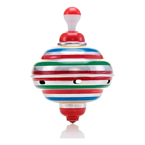 Esse pião é um brinquedo clássico, fabricado em alumínio, com diversas cores. Para fazê-lo funcionar, basta bombear a haste metálica contra o piso e ele começa a girar.