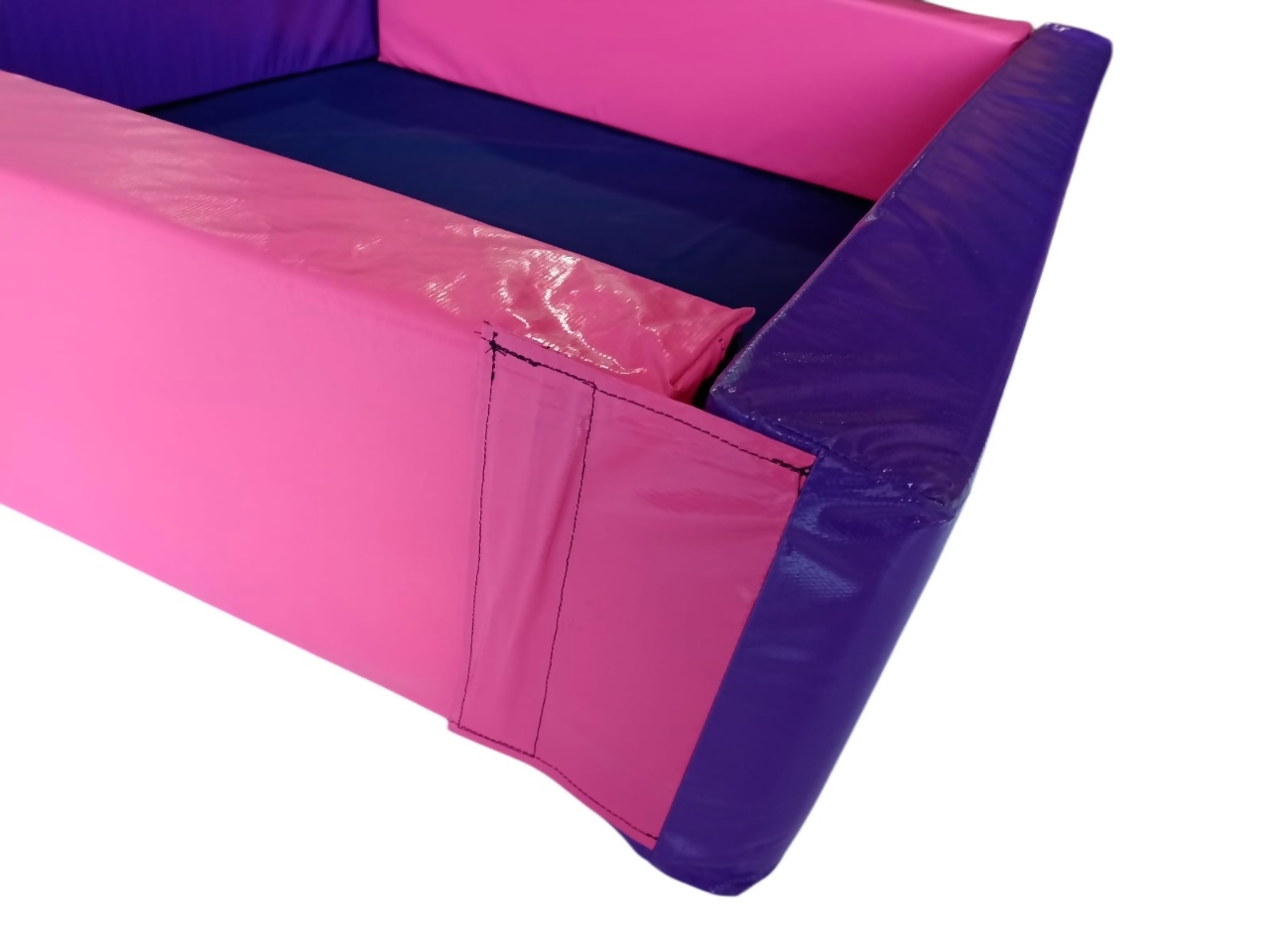 A piscina de bolinhas é feita em espuma com densidade D14 revestida em bagun extra brilho com fundo feito em tecido de nylon 600.