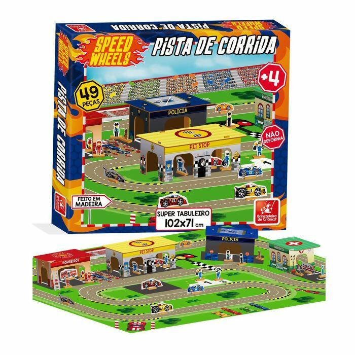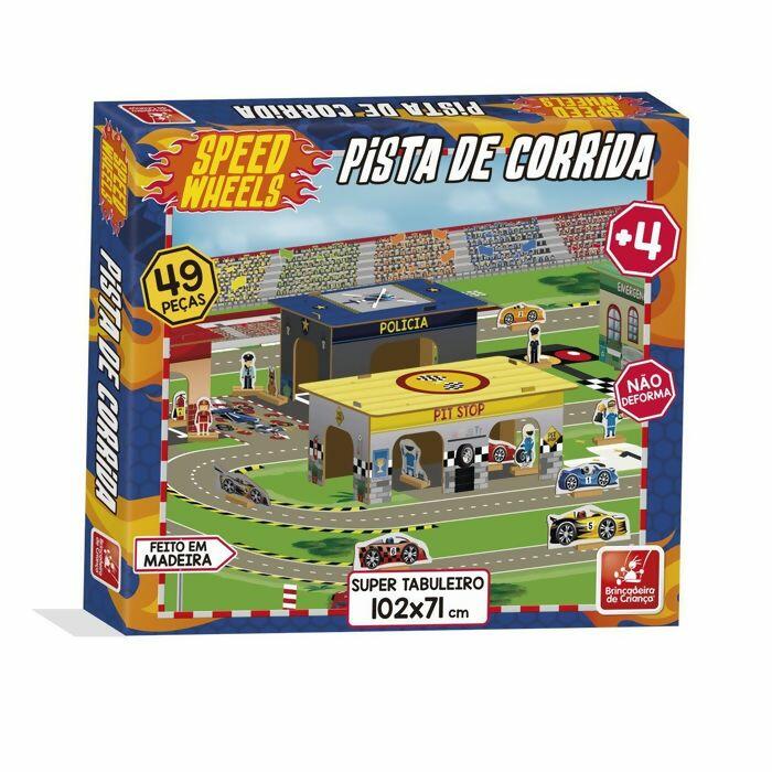A Pista de Corrida Speed Wheels é feita de madeira composta por: 1 (um) super tabuleiro (102 x 71 cm montado), 1 (um) manual de montagem e 49 peças para montar.