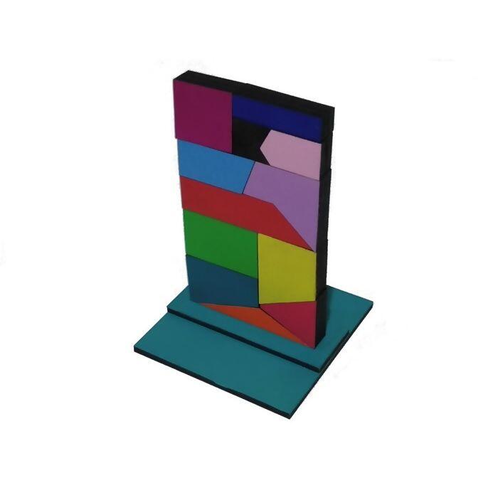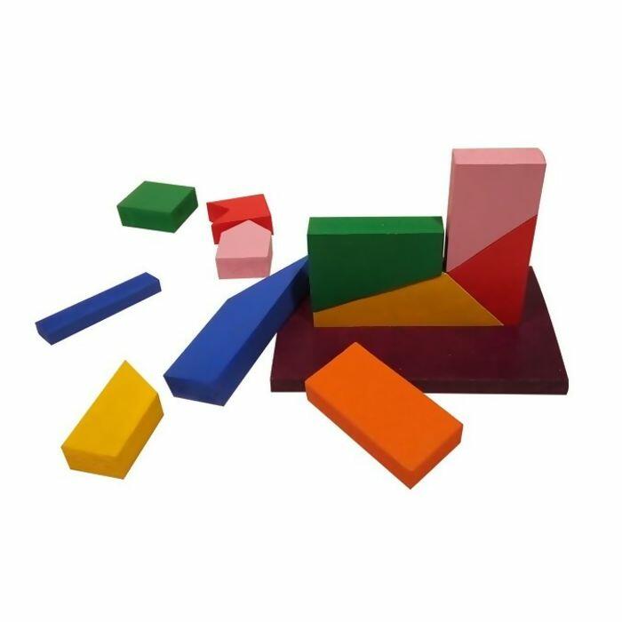 Base de madeira medindo 14 x 14 cm com 12 peças geométricas coloridas. Estimula a concentração, estratégia e percepção das figuras geométricas.