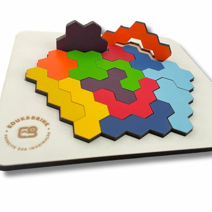 O tangran colmeia é um quebra-cabeça chinês. As crianças podem usar sua imaginação para criar formas, animais, objetos e até mesmo cenários.