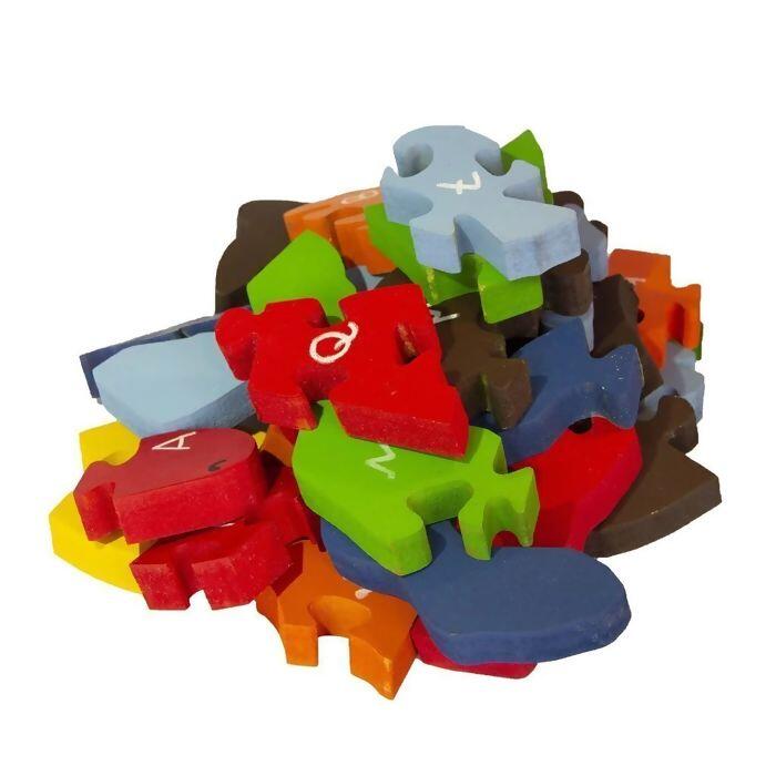 Quebra-cabeça educativo em formato de cavalo, com 26 peças coloridas. De um lado o alfabeto de A a Z, do outro a sequência de números de 1 a 26. Brinquedo confeccionado artesanalmente em madeira de reflorestamento e pintado com tinta atóxica.