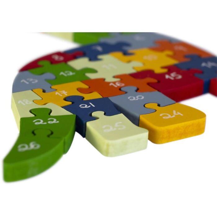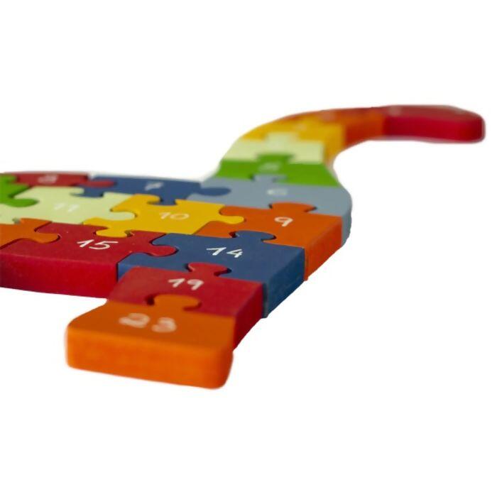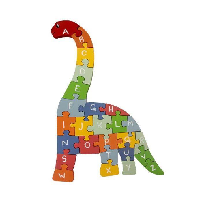 Quebra-cabeça educativo gigante em formato de dinossauro Braquiossauro, com 26 peças coloridas. De um lado o alfabeto de A a Z, do outro a sequência de números de 1 a 26. Brinquedo confeccionado artesanalmente em madeira de reflorestamento e pintado com tinta atóxica. Nossos brinquedos são elaborados para atender diversas idades e feitos a mão.