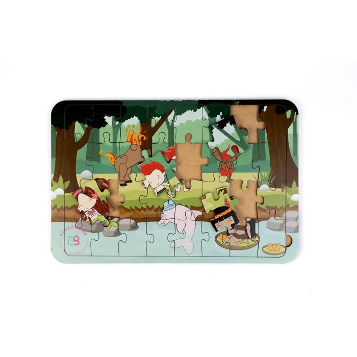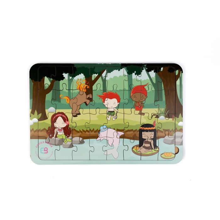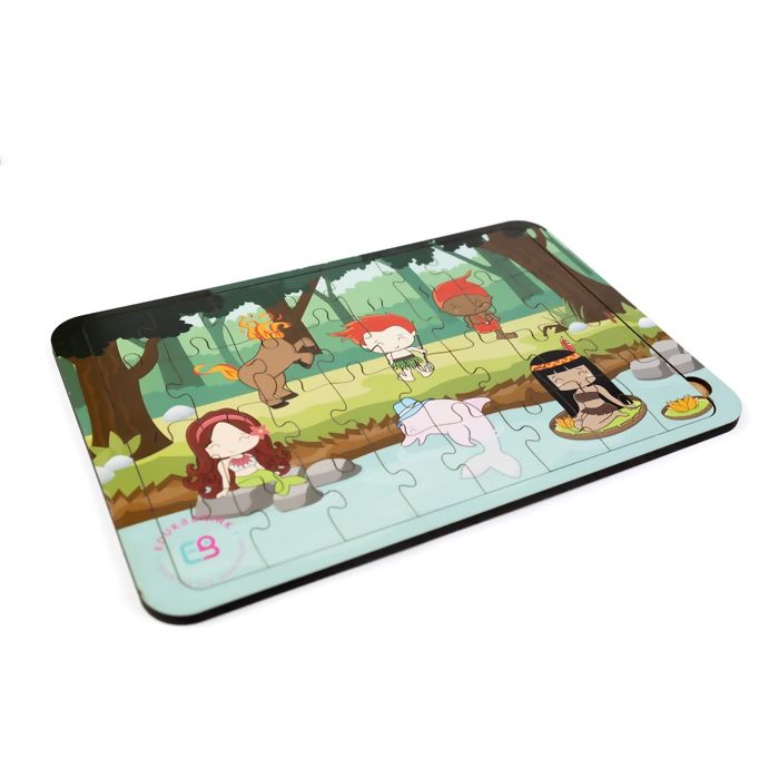 Quebra-cabeça em madeira ilustrado no tema do folclore brasileiro, com 32 peças e a base para montar.