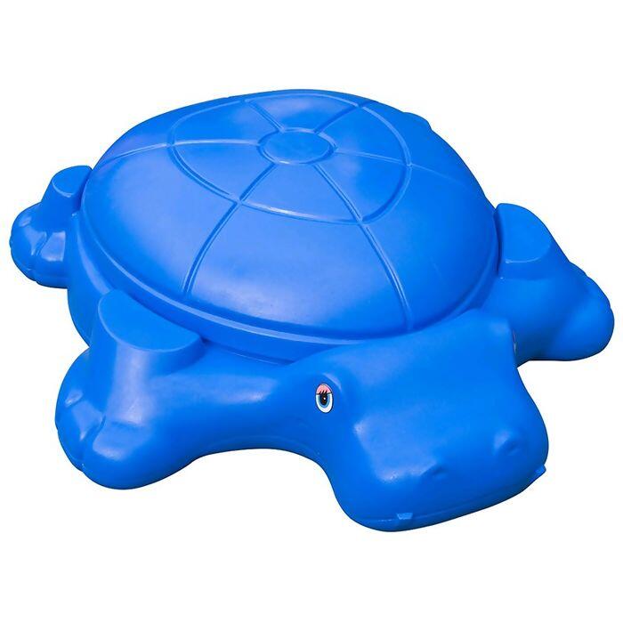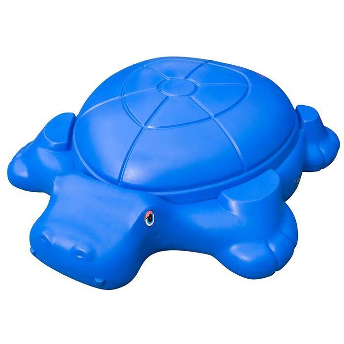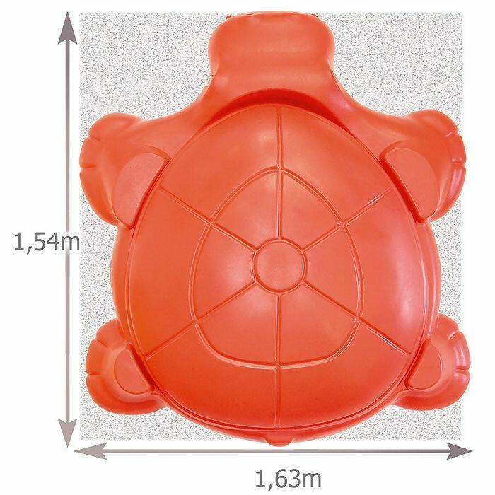 Possui tampa em forma de casco que serve para proteger a areia da chuva e de animais. Possui 4 assentos moldado nas patas. Pode ser usado como acessório em escorregador.