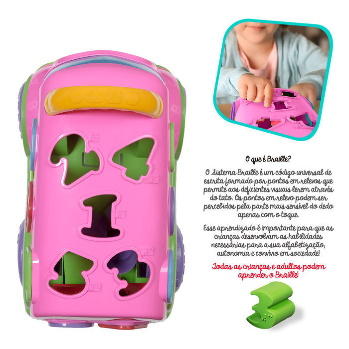 Na parte de cima do ônibus tem os números em Braille, Isso permite que as crianças com deficiência visual brinquem e aprendam também.