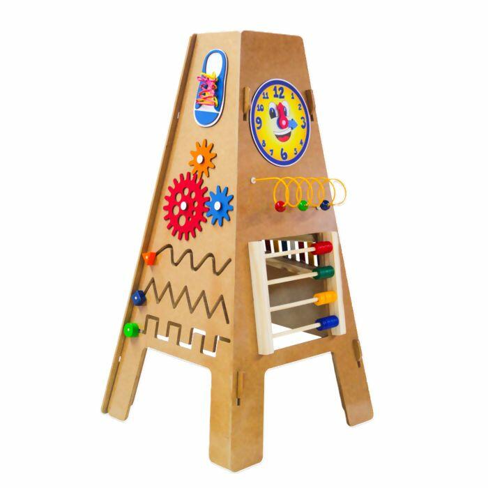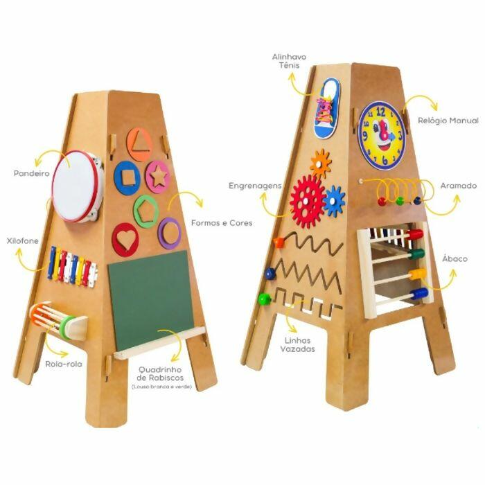Confeccionado com materiais de alta qualidade, incluindo M.D.F., madeira, metal, E.V.A. poliéster e plástico PP, o Totem Interativo oferece uma variedade de atividades educativas em suas 4 faces. De um lado, as crianças podem se aventurar no mundo da matemática com um ábaco colorido e formas para encaixar. Do outro lado, podem soltar sua criatividade em uma lousa branca e verde ou explorar habilidades de coordenação motora com alinhavo e engrenagens.
